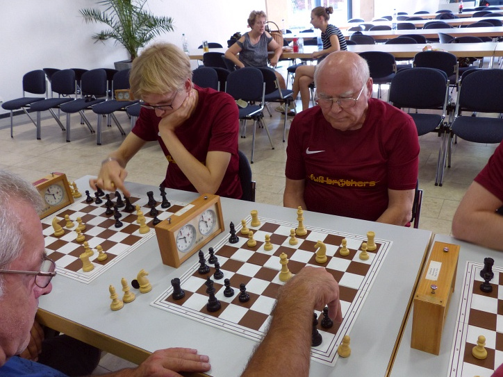 Honza hatte an Brett 8 eine schwierige Partie zu spielen. Nominell favorisiert, hatte er doch große Probleme, als Nachziehender einen Vorteil auf dem Brett zu erzielen. Die Stellung blieb nach vielem Manövrieren relativ geschlossen, und nach dem Damentausch deutete einiges auf Remis hin. Honza lehnte aber das Angebot zur Punkteteilung ab, besetzte letztlich eine offene Linie und drang in die weiße Stellung ein. Ganz am Ende stand ein Endspiel Läufer gegen Springer auf dem Brett, bei dem zwei schwarze Freibauern unaufhaltsam in Richtung Grundreihe vorrückten.