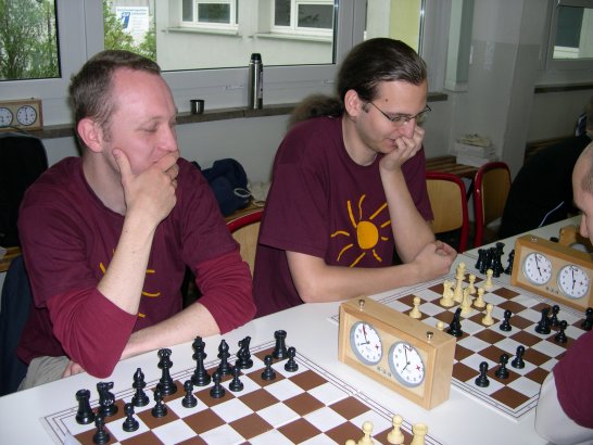 Robert hatte gegen Cliff Walther an Brett 6 nach positionellen Ungenauigkeiten einen schweren Stand. Er büßte die Qualität ein, kämpfte sich wagemutig zurück, fand jedoch in Zeitnot nicht die erfolgversprechende Abwicklung ins Endspiel, wonach die Stellung zerbrach. Mehr Glück hatte dagegen Sascha am Spitzenbrett, dessen Kontrahent IM Heiko Machelett seinen Angriff nicht konsequent zu Ende spielte. Sascha konterte das ausgebliebene Figurenopfer mit zäher Defensivarbeit, was uns einen überraschenden und hochwichtigen halben Punkt eintrug.