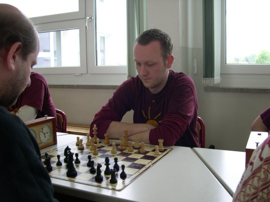 Gegen 9.15 Uhr ist die Mannschaft schließlich komplett und der Mannschaftskampf kann losgehen. Nach etwa einer Stunde fällt am letzten Brett die Entscheidung zu Gunsten von Gerhard. Sein Gegner entscheidet sich, das Endspiel vier gegen einen Bauern nicht weiterzuspielen.